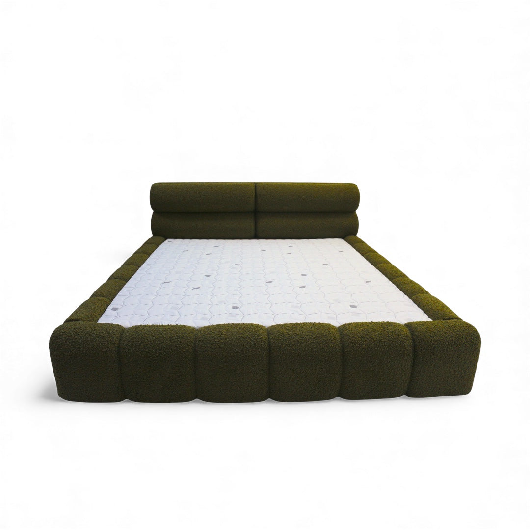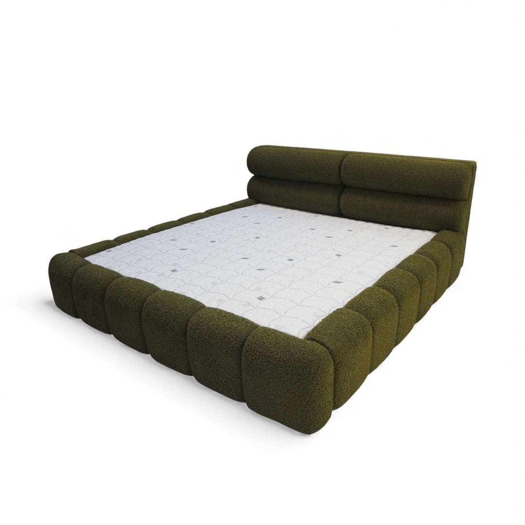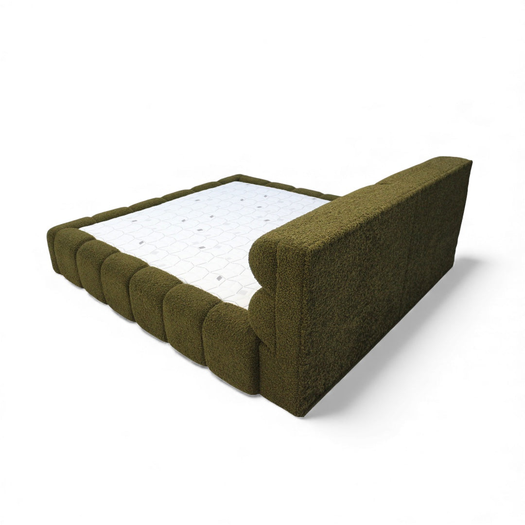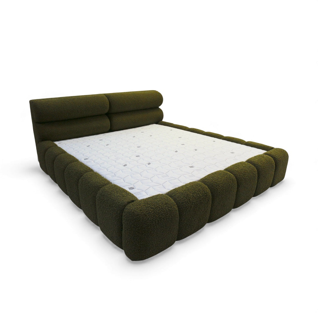 Forma внася смело, обгръщащо присъствие в спалнята. Тапицирана в богато маслинено букле, тази рамка за легло впечатлява с нисък, скулптурен силует, меки заоблени ръбове и дълбоки канални линии — създавайки топла, модерна визия, която изглежда толкова комфортна, колкото и е на допир.