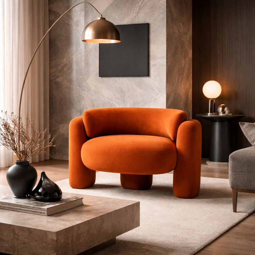 The Orbit Armchair stands out with its rounded silhouette and soft visual presence, making it especially relevant in interiors that embrace fluidity and warmth.