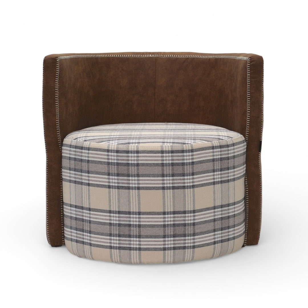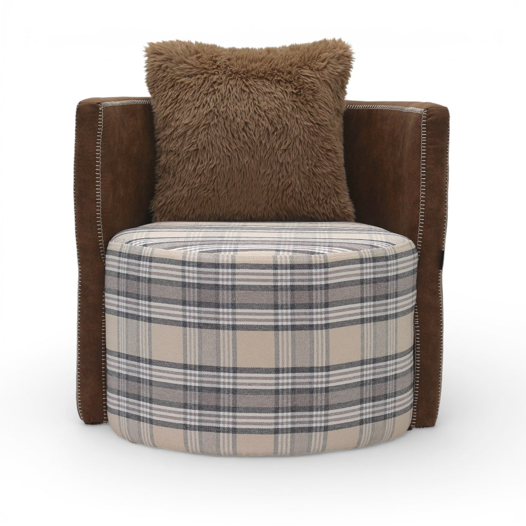 The Corvyn Collection pairs classic plaid upholstery with warm, structured arm detailing for a refined yet inviting look. Designed for comfort and durability, each piece features plush accent cushions and elevated metal legs for a modern, airy feel.