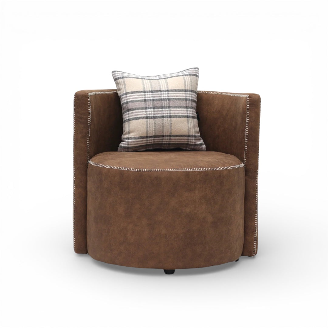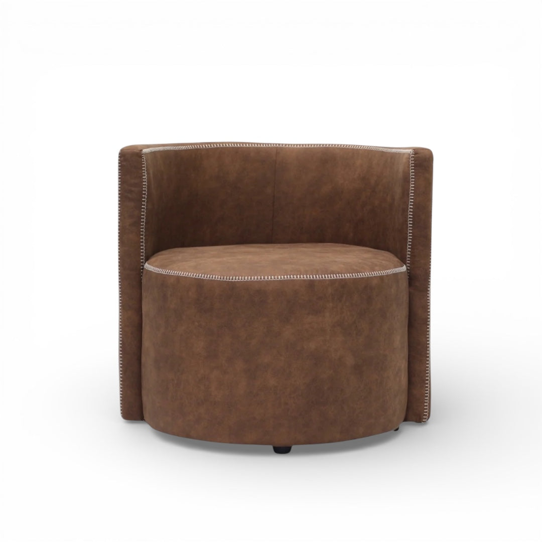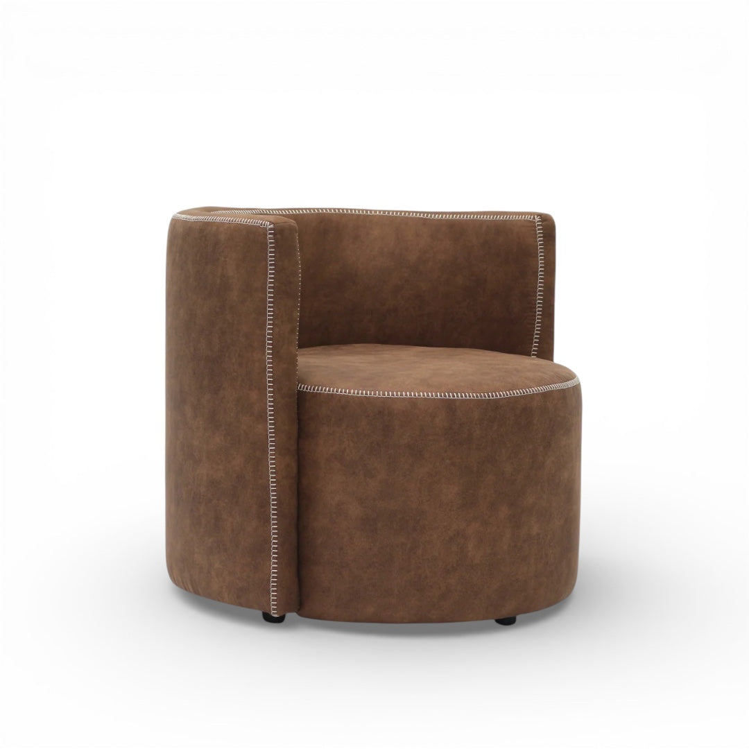 Corvyn is a bold accent armchair with a cozy, modern presence — designed to elevate a space with sculptural softness and a refined, wrapped silhouette. Upholstered in smooth eco leather, Corvyn features a deep, supportive seat and gently enclosed sides that create a comfortable “cocoon” feel, while the contrast stitch detailing adds character and a tailored finish.
