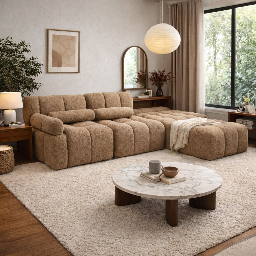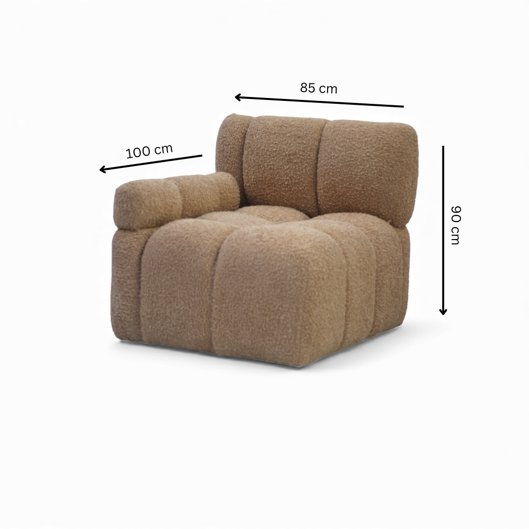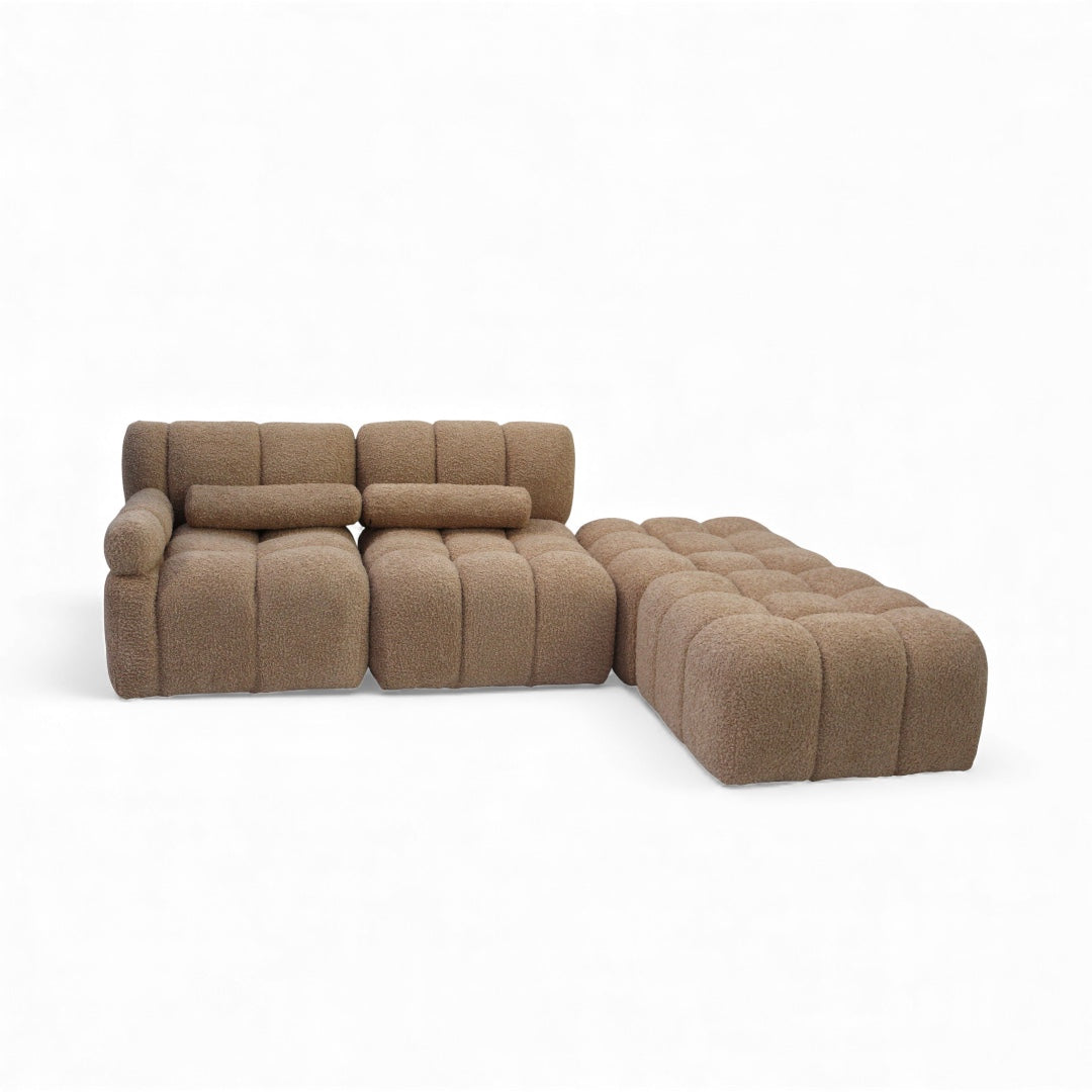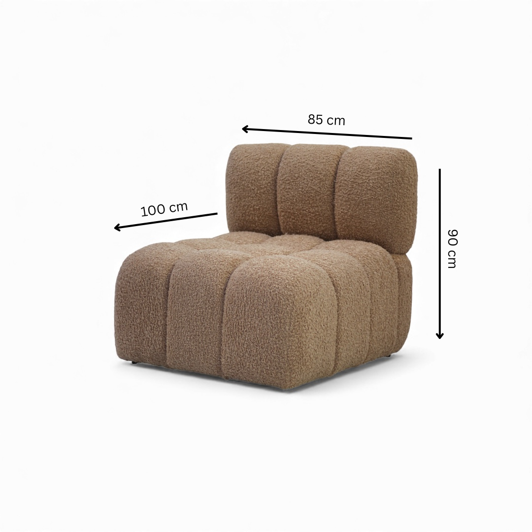 Moducube brings bold comfort and clean modular design into one statement-making sofa. Upholstered in soft, textured bouclé in a warm taupe tone, it features a plush, cube-like silhouette with generous channeling and deep cushioning — made for lounging, stretching out, and everyday relaxation.