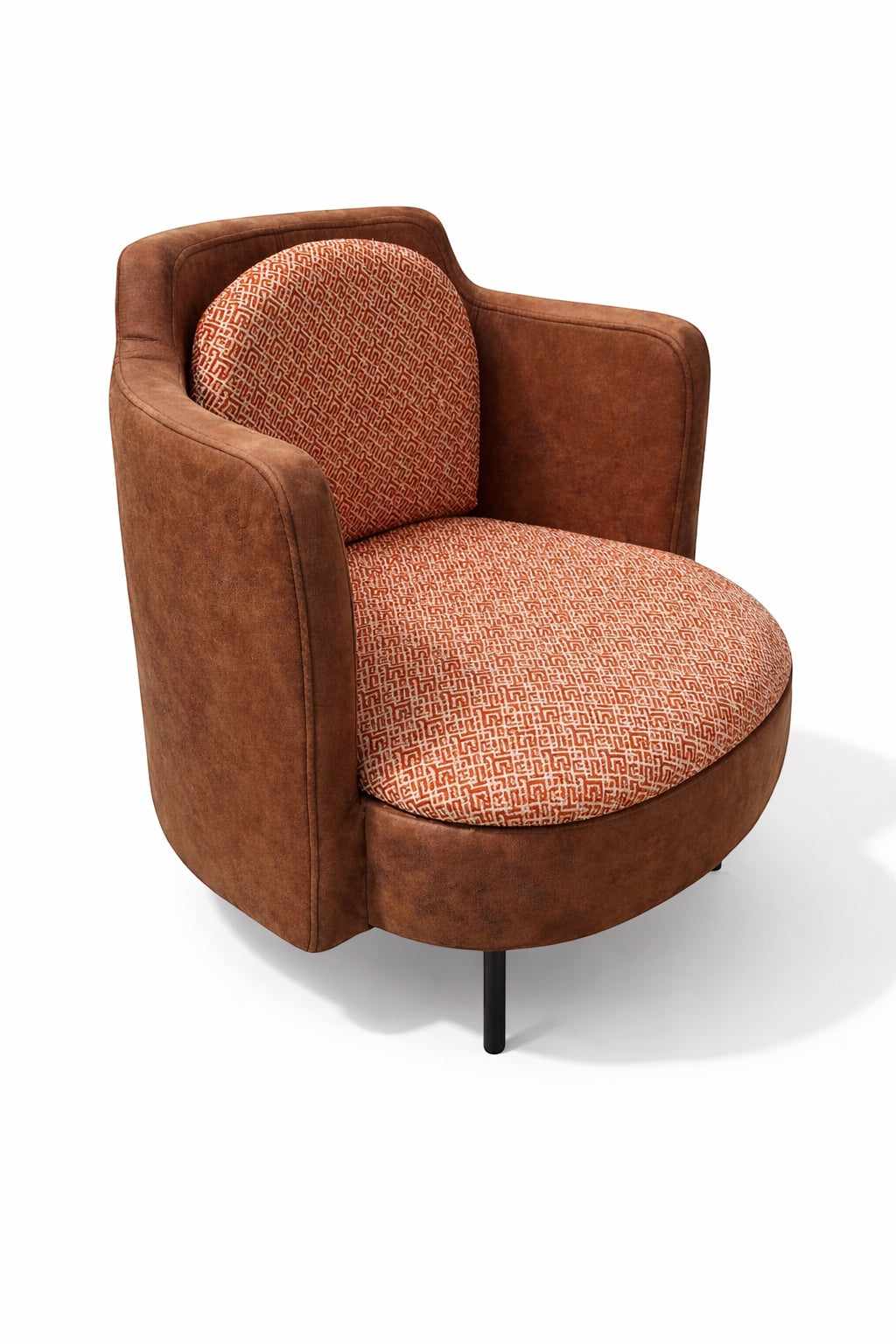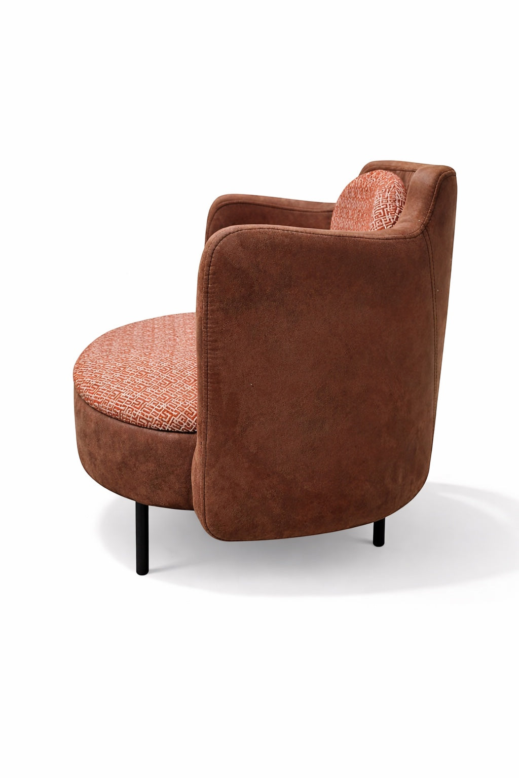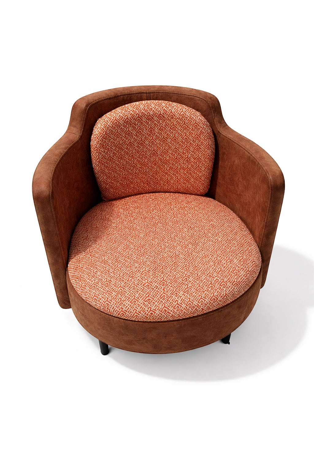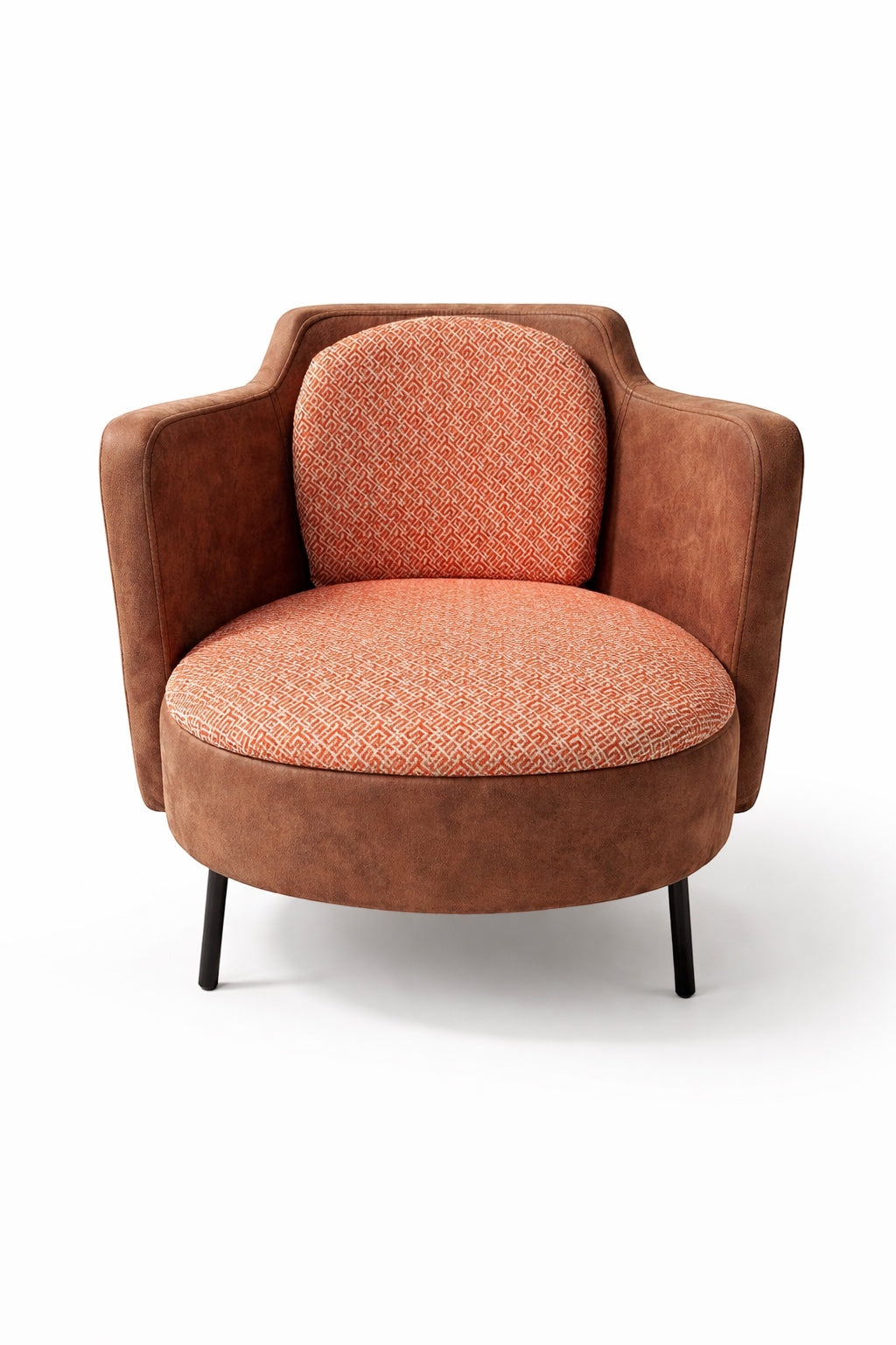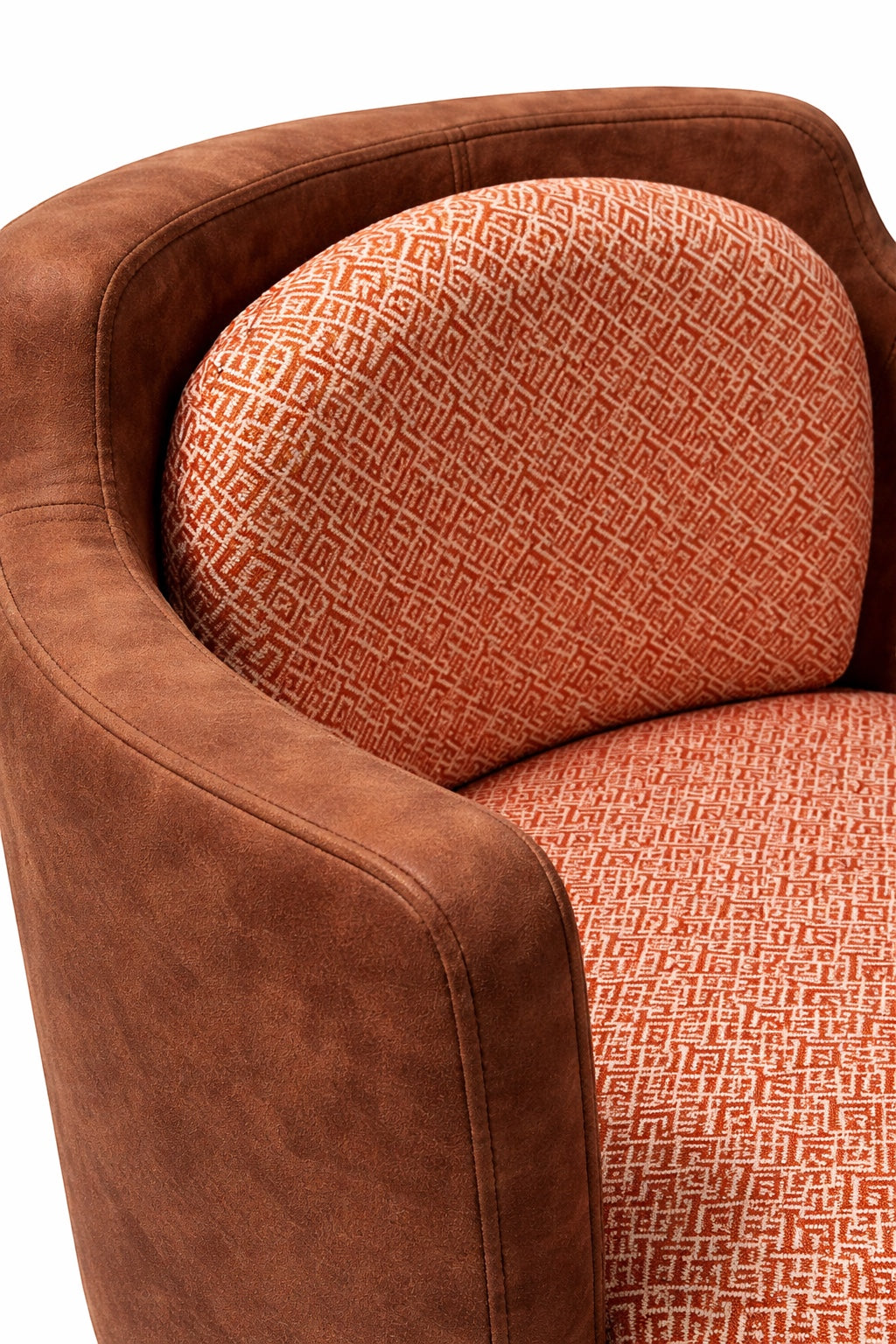 Terracotta is a warm expression of comfort and refined contrast. Defined by its rounded silhouette, eco-leather outer shell, and front upholstery with orange geometric shapes on a white background, this armchair brings together tactile richness and contemporary character.