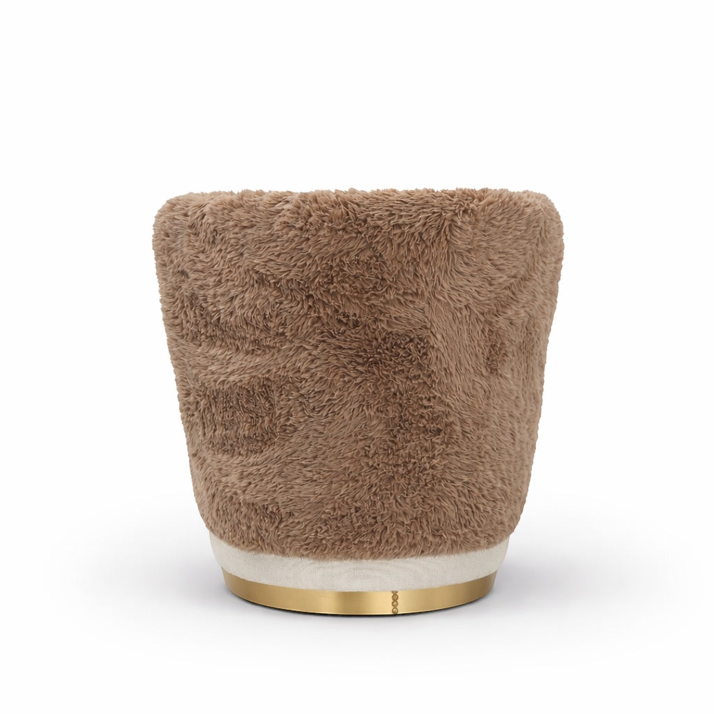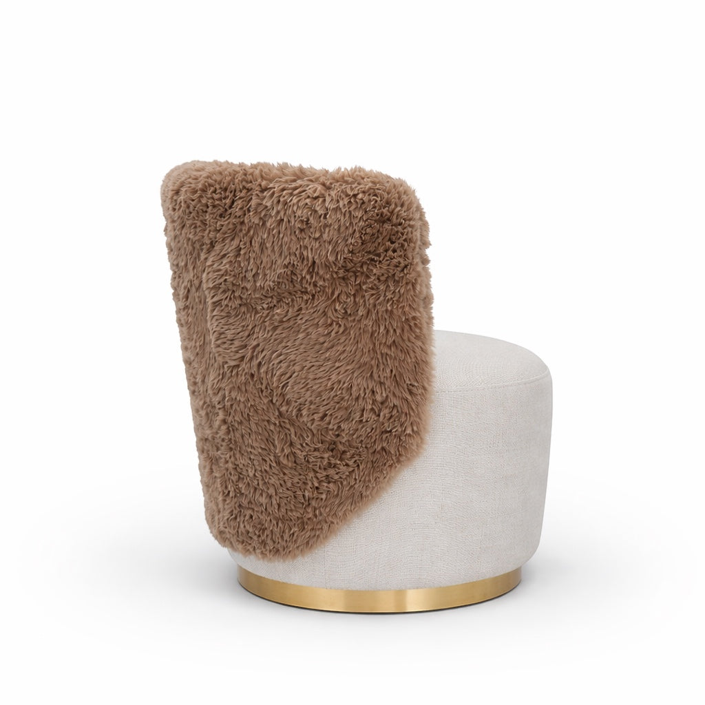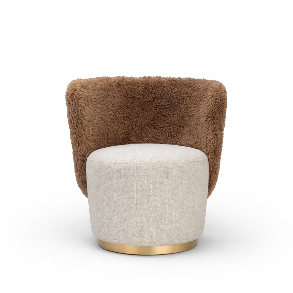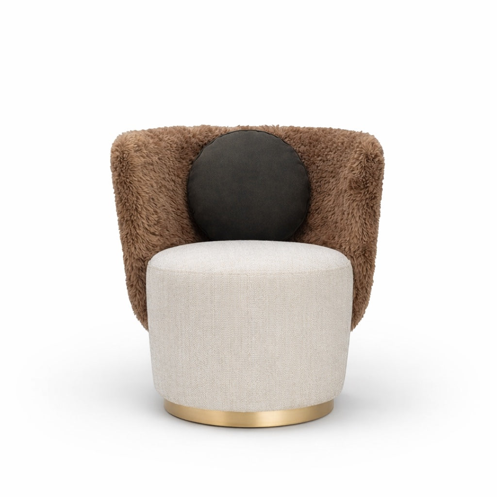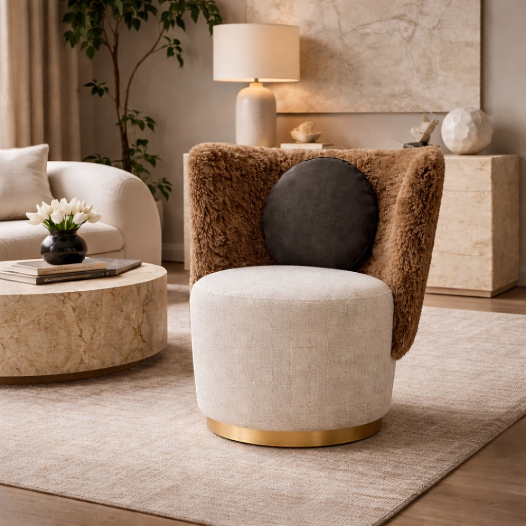 Valmont is a tactile expression of sculptural comfort. Defined by its enveloping wraparound back and grounded cylindrical base, this accent armchair merges softness with architectural clarity. The plush, fur-upholstered shell curves around the seat in one continuous gesture, creating a cocooning silhouette that feels intimate yet visually confident.
